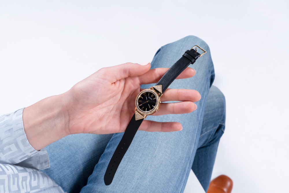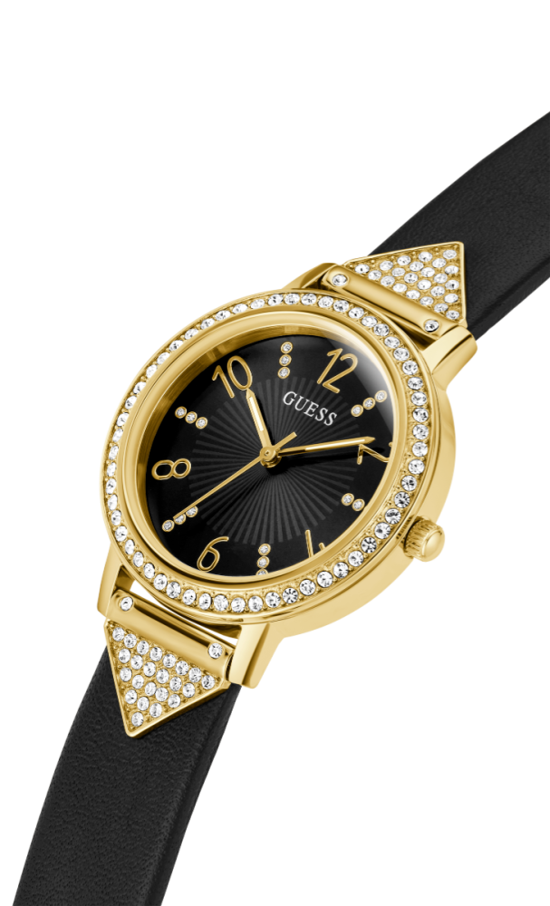 La Referenza GW0473L2 è un Orologio Solo tempo da Donna, la Cassa è in Acciaio da 32 mm di Colore Gold, Il quadrante è di Colore Nero con Indici Zirconati e Numeri Gold e la resistenza all'acqua è di 3 Atm.